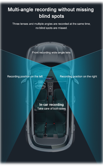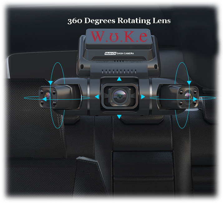 The front lens of the 360° Adjustable Rotating TRi (3) Lens Dash Camera, can be adjusted up and and moved from side to side. The right and left side camera lens are adjustable and can be fully rotated allowing for wide angle recoding that captures a full image from inside/outside of the car at the same time. Thus, providing almost a full front view, side views, inside views and rear views. Eliminating most bind spots.