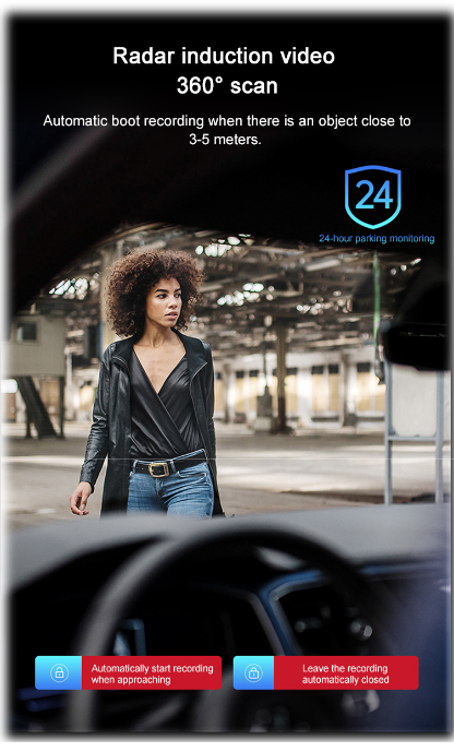 The parking monitor when connected provides a 24hour surveillance service. A dedicated ACC line adapter connected directly to the cars battery will keep the dash camera powered when the car is shut off. The dash camera will automatically turn itself on and record 1 minute video then turn off when collision or crash happens while parked.